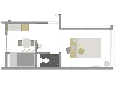 This comfortable and spacious Suite allows guests to control the door opening, lighting, audio system, automated blind, and television from their smartphone.