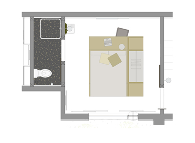 Esta cómoda residencia Habitáculo cuenta con los elementos funcionales necesarios para una estadía muy cómoda gracias a una división modular entre el espacio de descanso y el resto de la habitación. El huésped podrá controlar desde su dispositivo móvil inteligente la apertura de la puerta, la iluminación, el sistema de audio, la persiana automatizada, y la televisión.